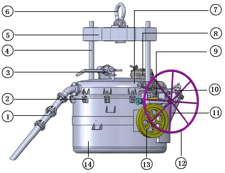 真空出鋁抬包主要由包體,內(nèi)襯、包蓋、吸鋁管、出鋁管、引射器、吊運(yùn)架、蝸輪、傳動機(jī)構(gòu)等組成。
